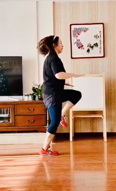 原地进行高抬腿,左手拍左膝盖,右手拍右膝盖,频率根据自己身体情况而定,做两组,每组进行10~20秒,组间10秒。