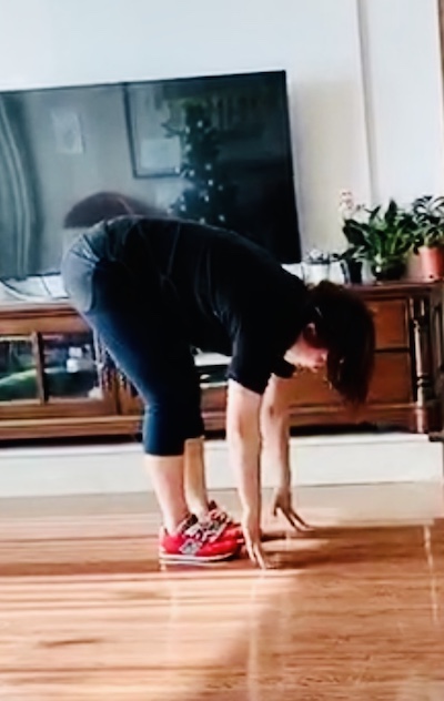 站姿,俯身向前,手在地面上小幅度行走,保持身体平直,直至达到最大幅度。然后,前脚掌着地,小步向前快速行走,保持膝关节伸直的情况下达到最大幅度。进行5~10次。