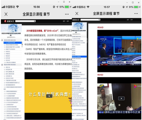 该课程利用手机或电脑线上学习,由新型冠状病毒基础知识篇、预防感染篇、就医治疗篇、一些误区以及国家卫健委公众预防指南等五章组成。课程全面介绍了防控新型冠状病毒感染的肺炎相关知识,内容丰富,实时更新,针对性强,学习方式灵活,极大便利了师生员工居家学习。