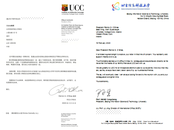 2月11日,爱尔兰科克大学校长Patrick G O’shea教授第一时间发来慰问信。