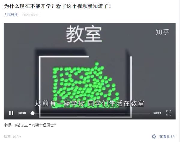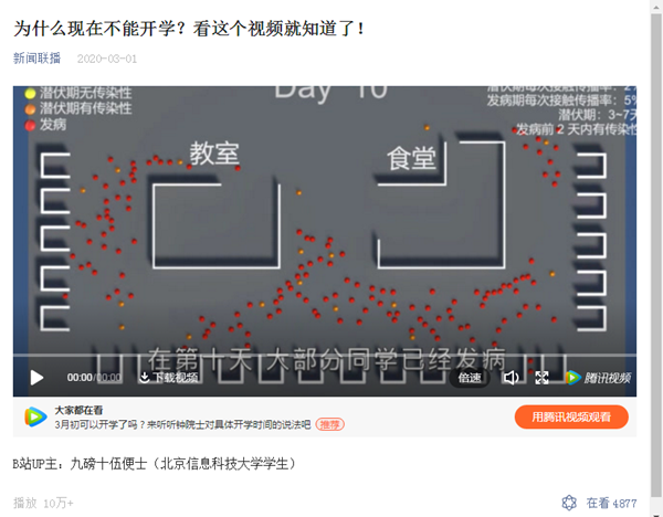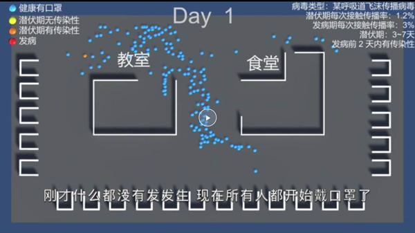 视频模拟了一个由教室、食堂、学生公寓组成的简单的学校场景,其中,不同颜色动态点代表不同情况的学生,模拟了在全体同学不戴口罩、戴口罩但是发病不隔离、发病后隔离等各种情况,最终得出结论,即便是大家都认为最安全的全体同学戴口罩且发病同学被隔离的这种情况,也可能会导致较大范围的感染,从而科学、形象地向大家解释学校为什么还不能开学。