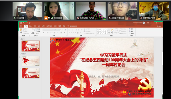 时值习近平总书记在纪念五四运动100周年大会上发表重要讲话一周年之际,校团委号召广大青年学子重读讲话内容,学习讲话精神,各学生组织也自觉组成讨论小组,通过线上诵读、视频会议、思想讨论等形式,重温习近平总书记对新时代中国青年提出的六点要求,明确新时代中国青年使命担当,坚定制度自信,练就过硬本领,热爱伟大祖国。