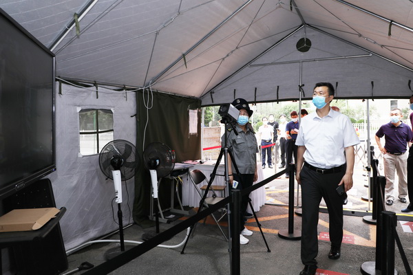 张永凯一行在学校门口查看测温设备,了解进出校园管控措施,叮嘱安保人员做好自身防护,要求一定要把好进出校园测温登记关口,尽一切努力将疫情防控关口往前移,维护校园安全。