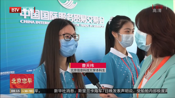 早上8点10分,北京电视台新闻频道在《北京您早》栏目直播中对三名服贸会志愿者代表进行了采访。三名志愿者同学分别负责路线引导、体温测量和科技抗疫案例展示区的展览讲解,其中负责科技抗疫案例展示区展览讲解的这位志愿者正是来自taptap点点经管学院市场营销1901班的曹天祎同学。
