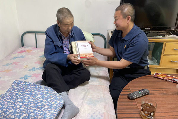 6月2日,学校党委副书记周志成来到小营离休党支部书记崔春荣同志的家中,为崔老送去党史学习教育资料和慰问物品,与崔老共学党史、共忆峥嵘岁月、共话初心使命。