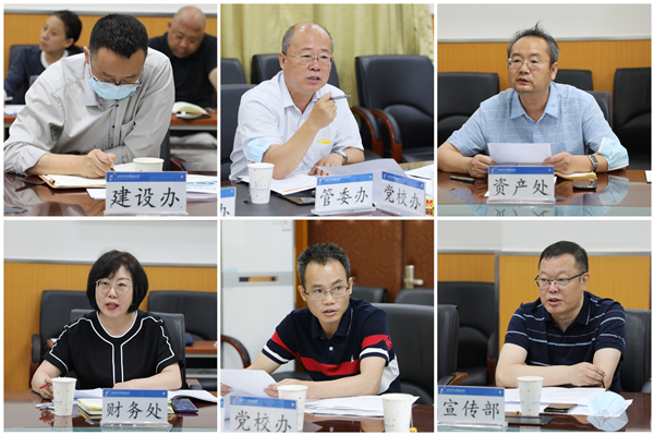 新校区建设办主任崔凯汇报新校区建设工作进展情况;新校区管委办常务副主任赵立胜汇报新校区搬迁工作进展情况;资产处处长胡滔、财务处处长张莉、党办主任王智勇、宣传部部长杜世智、教务处处长米洁、学生处处长张景波、后勤处处长郑召义、安稳处处长龚汉明、信息网络中心副主任(主持工作)王明涛,针对新校区管委办函询内容,分别就各自负责工作进行了汇报。