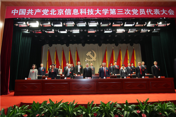 会场气氛热烈,庄严隆重。主席台正上方悬挂着“中国共产党taptap点点官方网站第三次党员代表大会”的会标,后幕正中是镰刀和锤头组成的党徽,10面鲜艳的红旗分列两侧。会场正后方设立“守初心 担使命 作贡献 促发展 为建设信息特色鲜明高水平应用型大学而努力奋斗”主题背景。