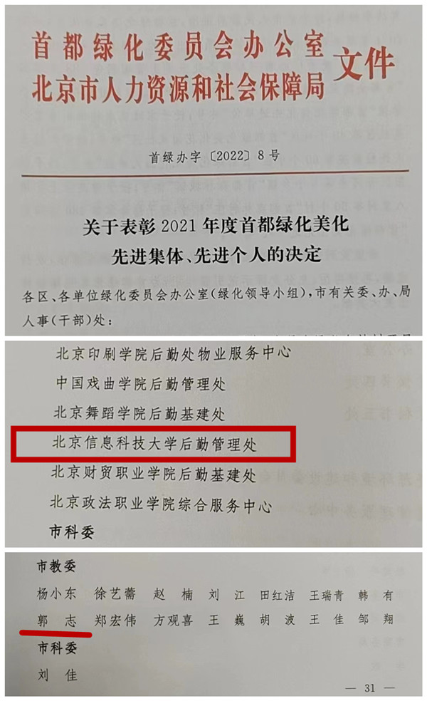 近日,首都绿化委员会办公室、北京市人力资源和社会保障局联合发布了《关于表彰2021年度首都绿化美化先进集体、先进个人的决定》(首绿办字〔2022]8号)。经过严格的“两审三公示”程序,学校后勤处喜获北京市全民义务植树先进单位,后勤处管理科科长郭志被评为2021年度首都绿化美化先进个人。