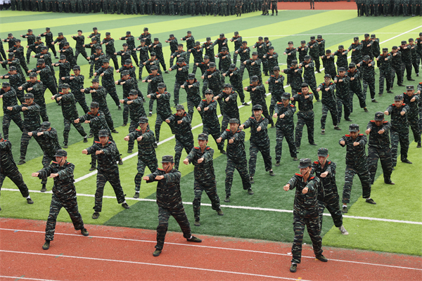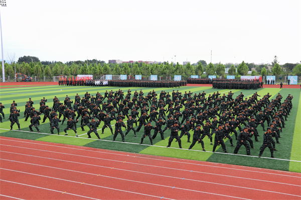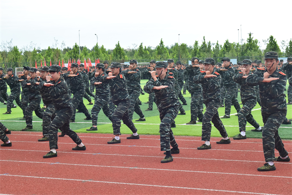 军事训练科目汇报表演中,同学们依次展示了擒敌拳、军体拳、匕首操等军事科目,动作娴熟、反应迅速,赢得了观礼台上老师们的阵阵掌声。