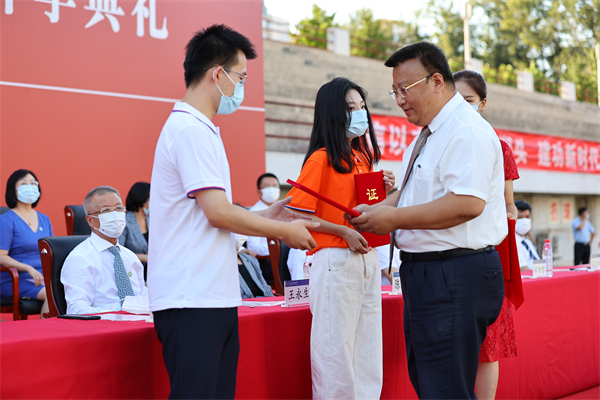 校党委书记王传亮向2022级研究生新生奖学金获得者代表颁发证书。