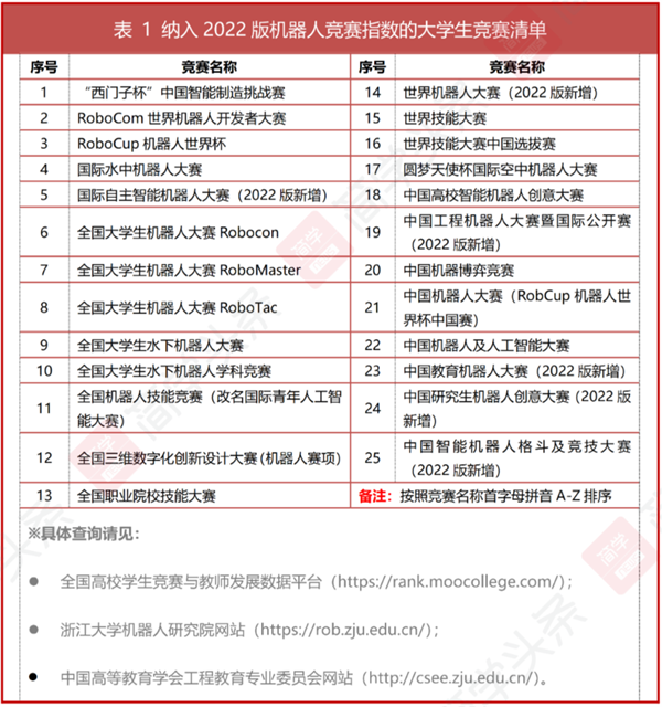 “全国普通高校大学生机器人竞赛指数”由中国高等教育学会工程教育专业委员会联合浙江大学机器人研究院发布。本轮指数共采集了25项高校机器人相关竞赛共216 640条数据(其中参赛数据188 945条,获奖数据27 695条),时间截止到2022年8月31日,从获奖贡献、参赛贡献两个维度构建评估模型。