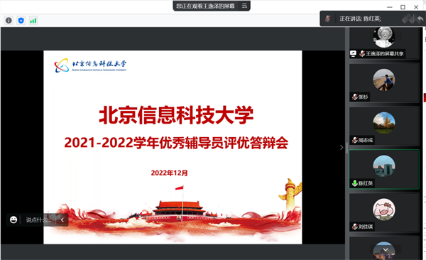 12月19日下午,学校线上举办2021—2022学年优秀辅导员、辅导员标兵评选答辩会。校党委副书记周志成,校党委常委、组织部部长李华涛,校党委常委、宣传部部长杜世智,校党委常委、统战部部长牛志英,纪委办公室、研工部、人事处、学工部、招就处、校团委相关部门主要负责人、各学院副书记(学生工作负责人)、辅导员参加答辩会。