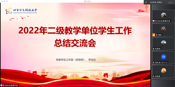 12月27日下午,2022年二级教学单位学生工作总结交流会在线上召开。校党委副书记周志成出席会议,校党委常委、组织部部长李华涛,校党委常委、宣传部部长杜世智,校党委常委、统战部部长牛志英,纪委办、研工部、人事处、招就处、学工部、校团委等相关职能部门负责人担任评委,各学院副书记(学生工作负责人)、全体辅导员到会观摩交流。会议由党委学工部部长张景波主持。
