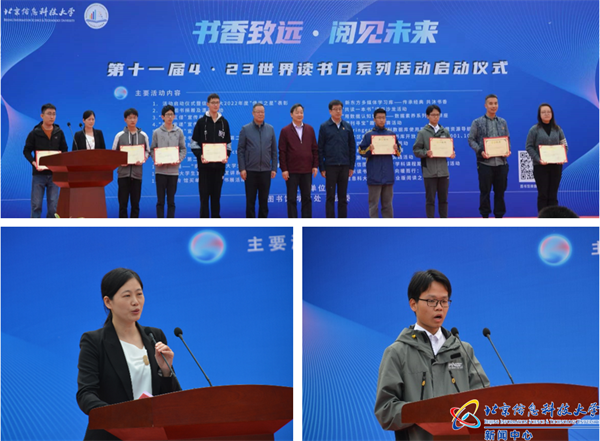 王文杰、方德英、杜世智共同为10位获表彰者颁发了“2022年度借阅之星”证书。经管学院王梅娟老师、信息与通信工程学院徐阳同学代表获得“借阅之星”称号的师生发表了获奖感言,分享了读书的快乐和收获。