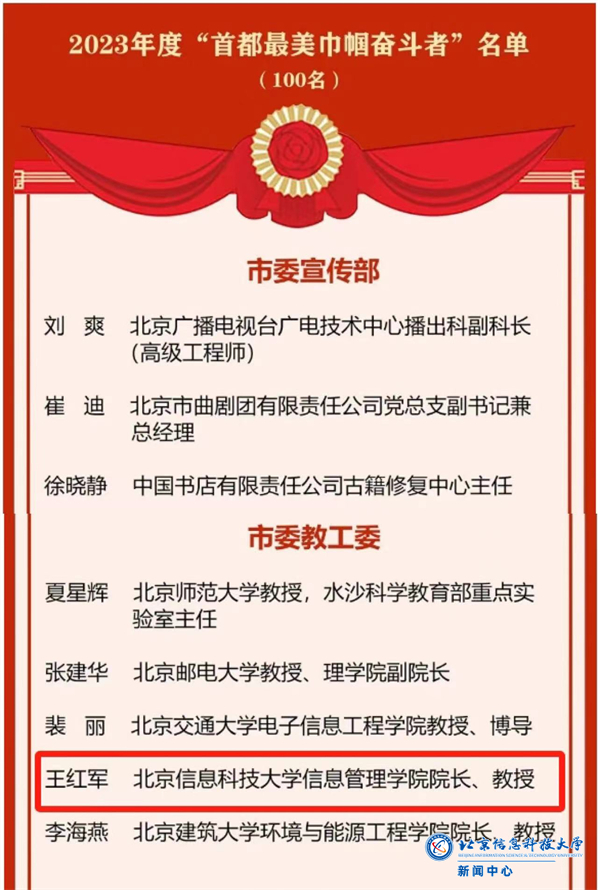 为大力弘扬“把使命铭记在心底,把奋斗写在征程上”的价值理念,团结引领首都妇女群众在科技创新、乡村振兴、文化建设、社会服务等各领域各战线奋勇争先,做时代的书写人、追梦的奋斗者,2023年,北京市妇联在全市开展“首都最美巾帼奋斗者”选树活动。经单位推荐、各系统初审、北京市妇联统一评选,最终全市有100名优秀女性入选。taptap点点信息管理学院院长王红军教授成功获评“首都最美巾帼奋斗者”。