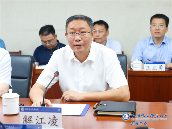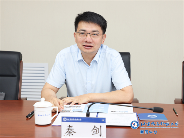 解江凌对秦剑一行来校调研指导表示欢迎。解江凌介绍了学校事业发展情况,着重介绍了近年来学校融入新发展格局,成功获批博士点、新校区建设搬迁等突破性成就,以及学校坚持创新引领、内涵式发展,以高质量产教融合服务国家首都战略需求,充分发挥信息类学科优势和创新应用型人才优势、助推科技事业发展做出的不懈努力。解江凌表示,学校将充分发挥自身优势,加快战略布局,持续提高科技创新水平和成果转化能力,提升特色专业人才输送质量和数量,加快形成新质生产力,为科技事业高质量发展做出新的更大贡献。