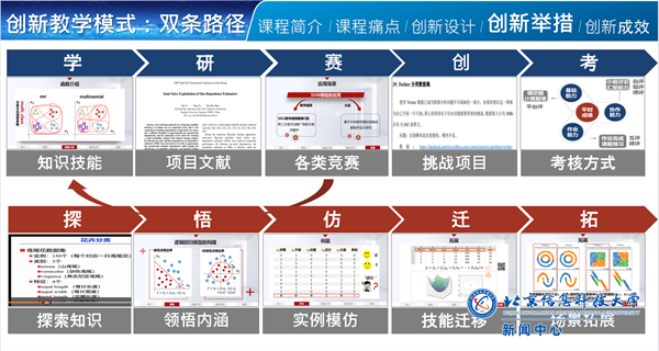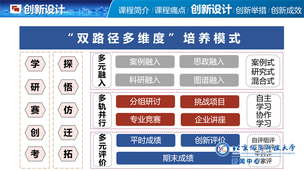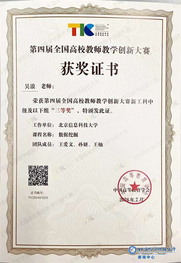 吴浪老师的参赛课程“数据挖掘”以其独特的教学理念、创新的教学方法和显著的教学成效,通过校赛、北京市级比赛等环节,在众多参赛作品中脱颖而出,荣获北京市一等奖。在教学过程中,吴浪老师提出了“双路径多维度”培养模式创新设计,在此基础上对教学内容进行优化重构,同时,注重培养学生的创新思维和实践能力,通过项目式学习、小组讨论等多种教学形式,引导学生积极参与课堂,提升学生综合素质。