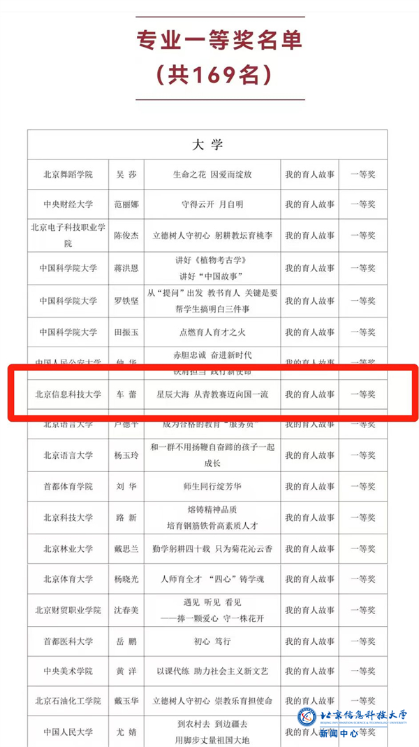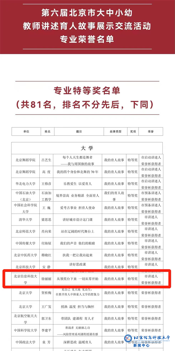 9月7日下午,在第40个教师节来临之际,由教育部、中国教育学会指导,北京市委教育工委、北京市教委主办,北京市学校德育研究会承办的“为党育人、为国育才——第六届北京市大中小幼教师讲述育人故事展示交流活动”举行。taptap点点体育部徐丽丽老师荣获特等奖被授予荣誉杯,并作为市级讲述人在颁奖现场作经验分享;管理科学与工程学院车蕾老师荣获一等奖。