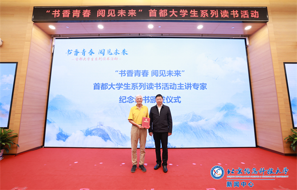 王达品为朱祖希颁发“‘书香青春 阅见未来’首都大学生系列读书活动主讲专家”纪念证书。
