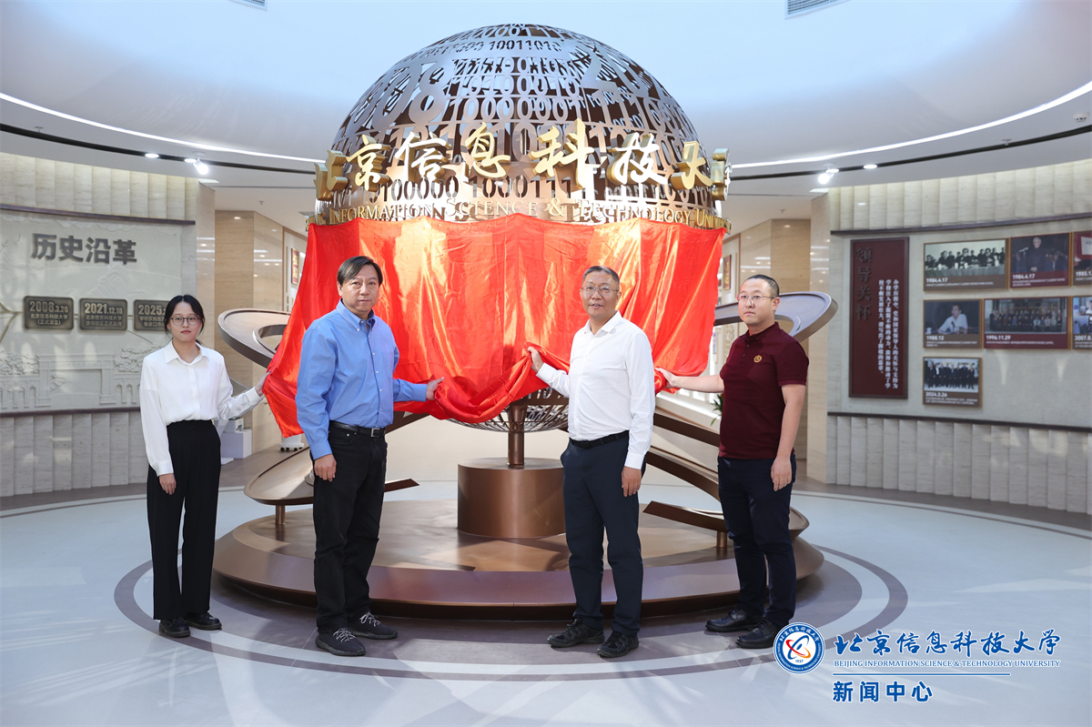 解江凌、郭福与学生代表、校友代表共同为校史馆揭幕。随着校史信息球红色幕布缓缓揭开,校史馆正式与广大师生校友见面。