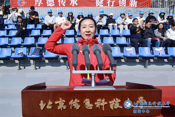 郭福致开幕词。他指出,体育是力量的角逐,是智慧的较量,是友谊的交融,更是无边界的文化交流与育人实践。郭福表示,学校将在一个月后承办首都高校第63届大学生田径运动会,届时将迎来80余所高校近2000名师生同场竞技,这是学校以体育为载体,外树形象的展示窗口,也是我们建设“全年大学”“三个校园”的生动实践。从破晓的跑道到深夜的训练室,从篮球场的激烈对抗到足球场的热血拼抢,信息科大学子始终坚持全面发展,勇追强国建设之梦。郭福号召全体运动员以“我命由我不由天”的拼劲赛出风采,以体育精神凝聚奋进力量,共同把本届运动会办成一个特色鲜明、青春活力、文明友爱的体育盛会。