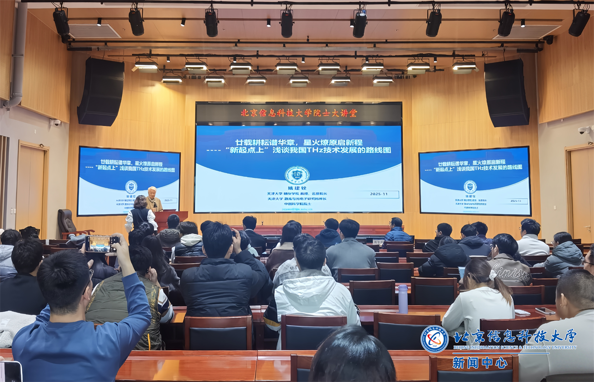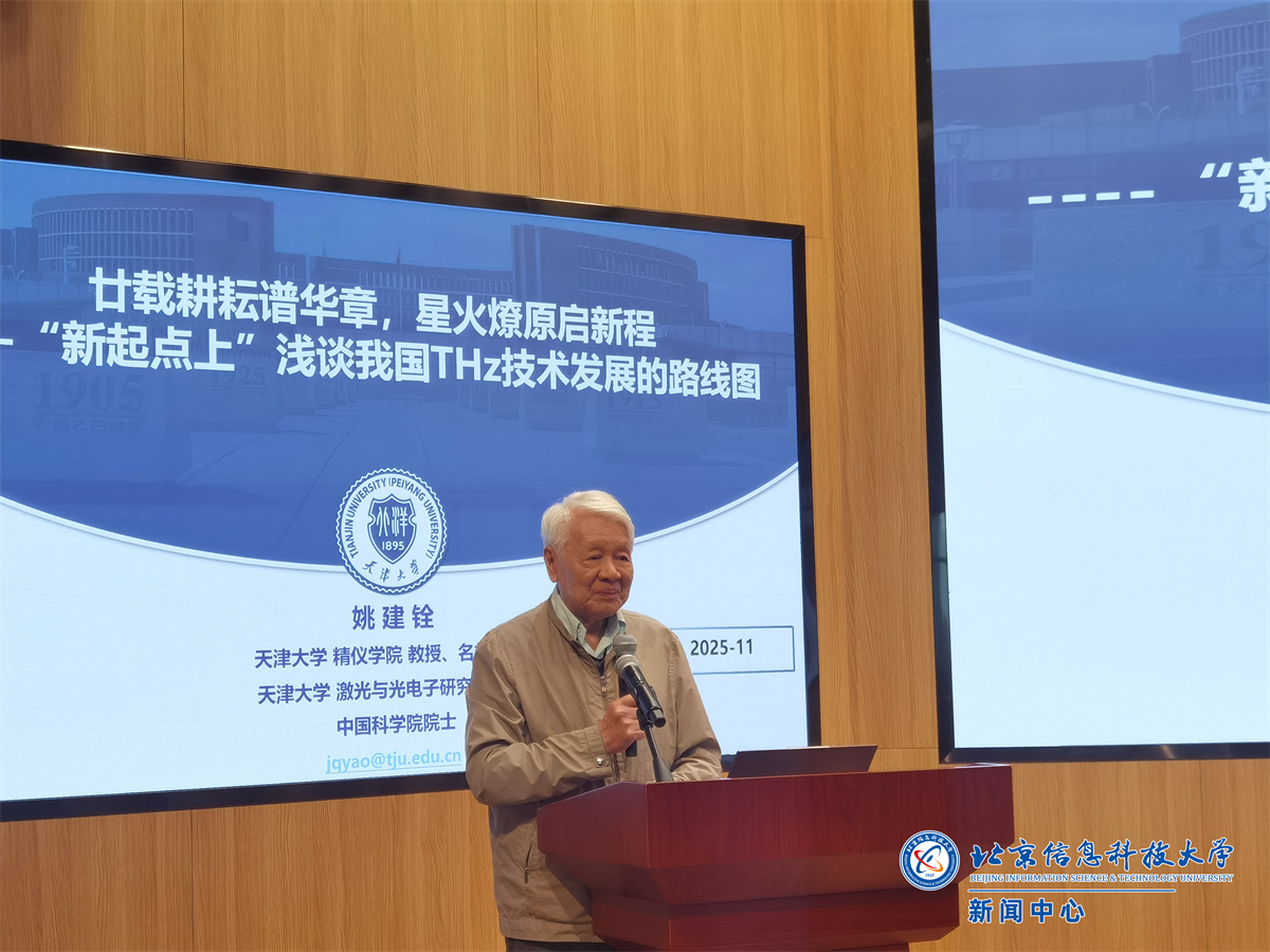 在揭牌仪式前,学校举办了“院士大讲堂”活动,姚建铨院士为师生作题为“廿载耕耘谱华章,星火燎原启新程——‘新起点上’浅谈我国THz技术发展的路线图”的学术报告。姚院士围绕太赫兹技术的最新研究进展与未来发展趋势,系统阐述了三大前沿方向的突破与探索:一是太赫兹波超表面调控技术的最新研究成果;二是太赫兹技术在生物医学探测、传感及成像中的实际应用与成效;三是太赫兹低空通信技术对低空经济发展的战略意义与推动作用。