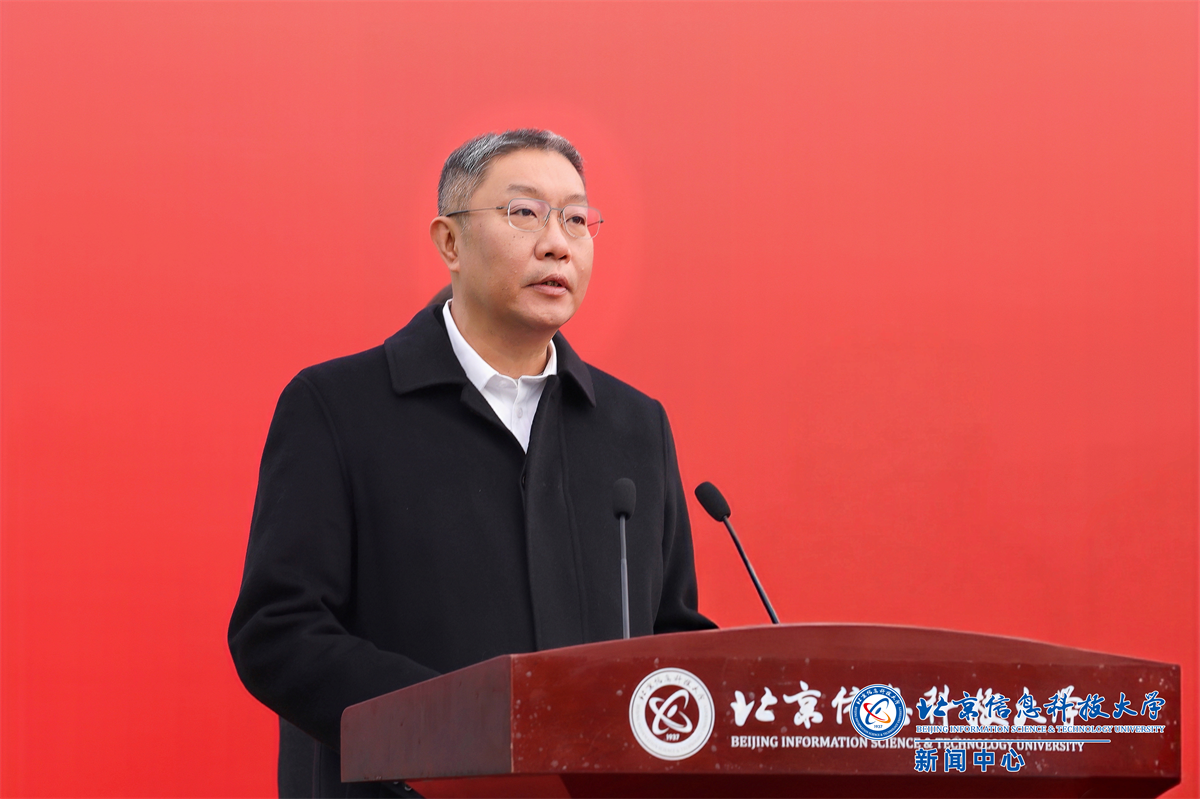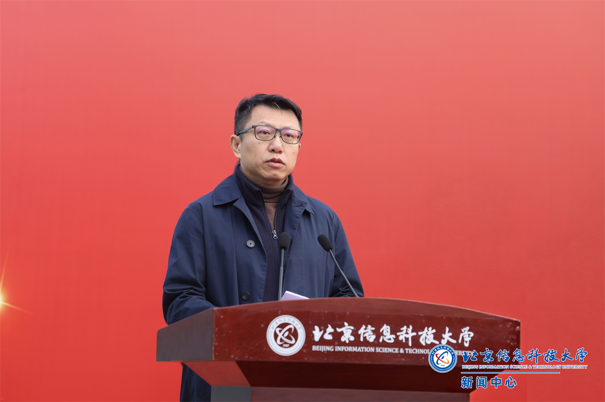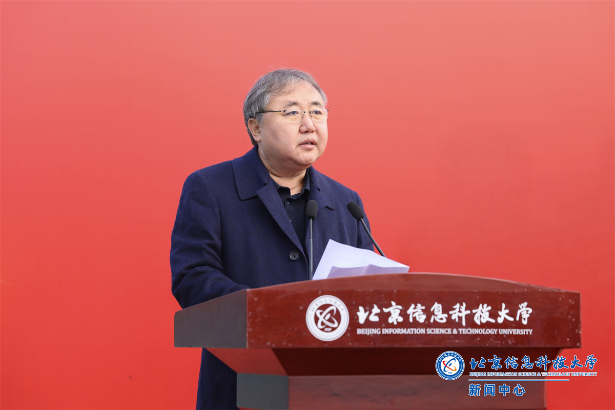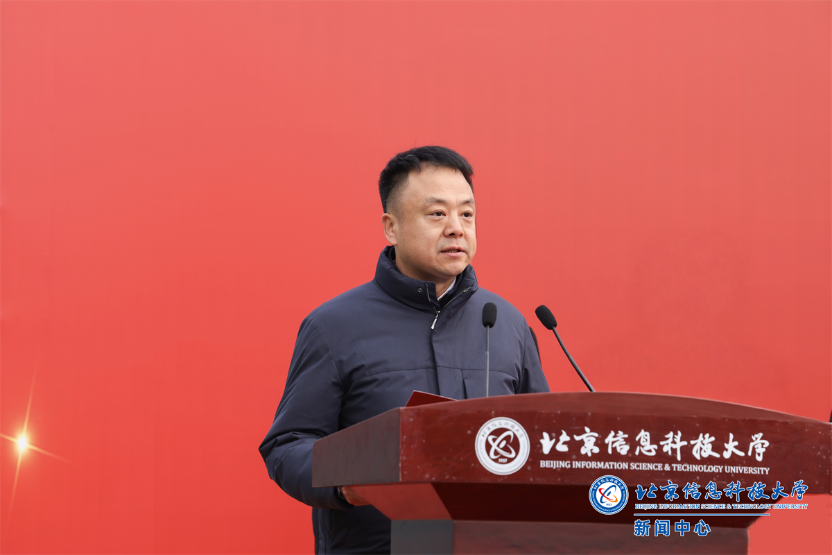 解江凌代表学校致辞,向莅临现场的各位领导、来宾表示热烈欢迎,向长期以来关心信息科大发展、支持沙河校区项目立项建设的市委市政府、市发改委、市规自委、市教委及各有关单位、各界友人致以诚挚感谢。解江凌介绍,沙河校区二期位于沙河校区北部,总建筑面积近16万平方米,涵盖宿舍楼、食堂、科学会堂等设施,是“服务发展”与“育人赋能”的重要载体。此次率先开工的5栋宿舍楼(近4.9万平方米),将满足3000名学生住宿需求,为学生“安居”与学校“三全育人”提供保障。围绕二期工程的推进,他重点强调了三方面工作:一是学校将切实履行主体责任。成立专项工作组,全程对接建设进程,及时协调解决实施过程中的衔接问题,确保工程推进“零障碍”;同时加强资金监管与质量管控,不辜负市委市政府的信任与师生期待。二是全力保障师生权益。施工期间将最大限度降低对教学与生活秩序的影响,并通过定期通报工程进展、邀请师生代表参与关键环节监督等方式,增强透明度与参与感,共同见证二期工程从蓝图走向现实。三是期待与参建单位深化协作。参与项目的设计、施工、监理等单位都是业界标杆,希望各方秉持“百年工程”标准,严守质量与安全底线,共同将项目建成“精品工程”与“放心工程”。