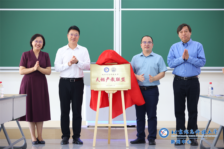 郭福、王学东与王兴芬、北京久其软件股份有限公司软件研究院院长芦星共同为天枢产教联盟揭牌。