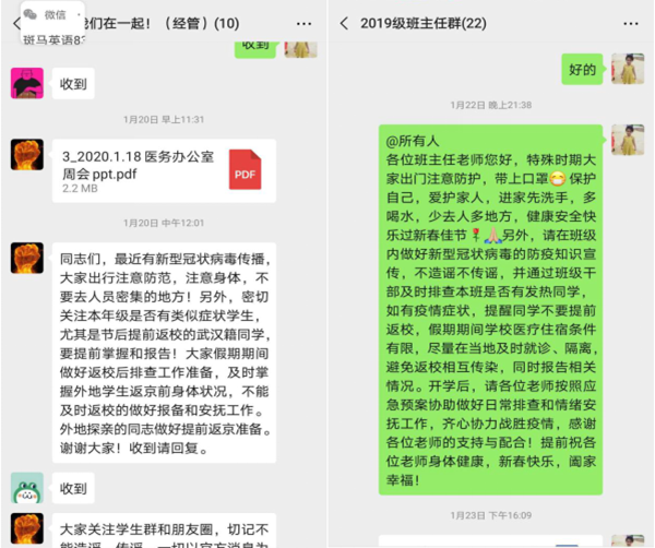 2020年1月20日,学校发出疫情相关信息,经管学院党委副书记马翔宇老师第一时间在学院学工队伍中发布关切信息,提醒大家关注学生群体信息和动态。紧接着21日,教育部发布了做好新型冠状病毒感染的肺炎疫情防控工作安排,那一刻作为敏感的一线学生工作者,我们意识到战“疫”工作已经开始了。