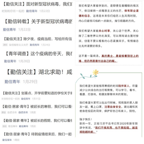 自新冠肺炎疫情发生以来,团委下属各大学生组织,以团学组织宣传平台为发声渠道,以坚定政治站位,从人文主义关怀角度积极传播官方主流媒体声音,引导广大青年师生带头遵守关于疫情防控的各项规定,自觉按照科学指引做好个人防护;正确认识当前疫情形势,树立战胜疫情的信心,不恐慌、不信谣、不传谣;注意自身安全,科学防疫,远离病毒。