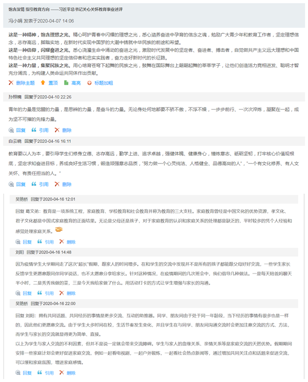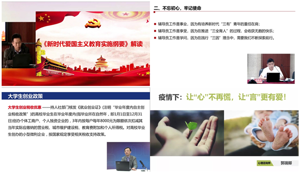 计算机学院辅导员张文兵:经过这次培训,让我再次对冰心说的:“有了爱,便有了一切,有了爱,才有教育的先机”,这句话理解地更加透彻。弘扬高尚师德,做一名有仁爱之心的辅导员,在推进社会主义思想政治教育事业的今天显得尤为重要。特别是在疫情防控期间,用心去管理学生,关爱学生,以心换心,才能得到学生的理解和支持,才能做好辅导员的本职工作。师生携手,共抗疫情,相信胜利之日终会到来!