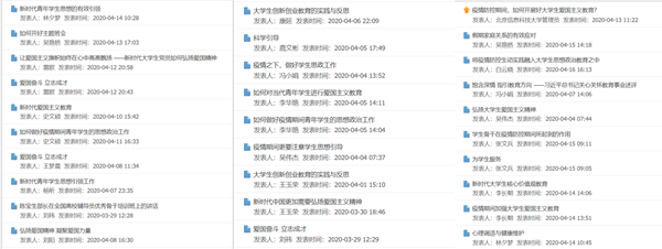 通信学院辅导员史文硕:疫情的突然来袭,让假期中的学生和我们面对了很多新的情况,新的挑战。学生的思想政治教育怎么开展?疫情环境下学生的心理问题怎么疏导?怎么引导学生在居家环境下有效学习?国内外形势迅速变化,各种信息纷至沓来,怎样引导学生筛选获取信息,坚定理想信念?正是这次培训解答了很多我们当下迫切需要解决的问题,提供了疫情背景下思想引导、情感疏导、学习辅导、行为教导、就业指导等各个方面的知识和方法。网络培训的形式,更是让我们每天在忙碌的信息收集、数据整理等疫情防控工作之余,能够利用碎片化的时间,实现知识的“零存整取”。希望能够借助此次培训的宝贵机会,提高自身作为辅导员的工作能力,更好地把疫情的“危险”转化为“机遇”,开展好爱国主义教育、制度自信教育、理想信念教育,更好地落实立德树人的根本任务。