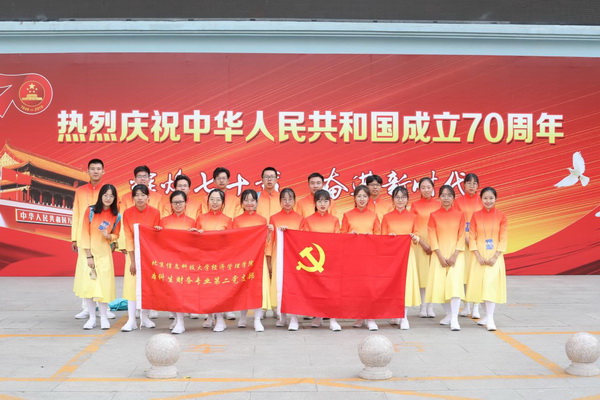 爱国有行动,支部成员担任国庆群众游行方阵骨干。共有10名党员、16名积极分子参与到了“70周年国庆阅兵群众游行”活动中,支部同学以优秀的行动表现、负责的态度履行着方阵小队长或基准兵责任,在训练中积极配合工作,督促、鼓励方阵同学认真训练,充分发挥了先锋模范作用。