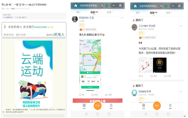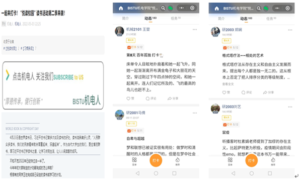学院举办了“早安、机电人”早起打卡活动,此次21天行为养成的“自律”文化活动,提高学生对好习惯的认知,帮助学生在活动中正确认识自己,唤醒自律意识;开展了“悦读校园”读书打卡活动,培养学生多读书、读好书、好读书的良好习惯,活动取得了良好效果;开展了一起“云”动——线上打卡活动,造了良好的体育锻炼氛围,培养了学生热爱体育、崇尚运动的健康理念,提高了学生的身体素质,锻炼了学生的意志品质。