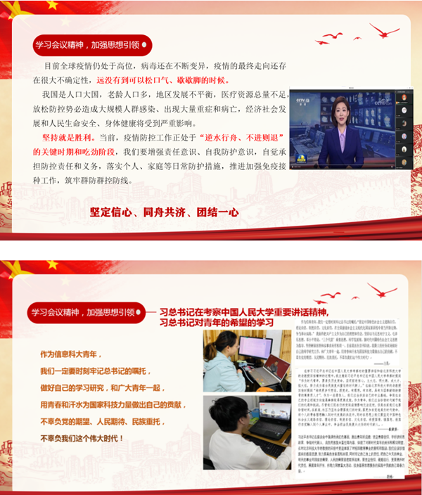学习会议精神,加强思想引领,坚持理论武装。战“疫”时不待我,坚持就是胜利。通过线上、线下学习《分析当前新冠肺炎疫情防控形势研究部署抓紧抓实疫情防控重点工作》的会议精神,增强学生党员、积极分子的责任意识,使他们深刻认识我国疫情防控的复杂性、艰巨性,深刻理解“坚持就是胜利”的含义,在我国疫情防控工作“逆水行舟、不进则退”的关键时期坚定信心。习总书记在考察中国人民大学重要讲话精神,增强支部成员理想信念,和责任担当意识。充分理解认真完成每一次疫情排查、每日准确进行健康打卡,做好每一件小事就是在做好疫情防控这件大事。