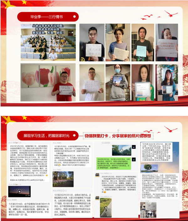 发挥榜样力量,展现学习生活,把握居家时光。发挥学生党员榜样引领作用,展现学生居家学习生活,每一张居家学习状态的照片,传递出居家上课要认真,要有“仪式感”;每一张学习笔记、学习计划图片,更是提醒同学们制定好学习目标,每日按计划执行,还可以给予自己每日完成“小奖励”;每一张居家劳动的照片,是生活的记录,更是提醒同学们合理规划居家学习生活,与父母融洽相处、积极沟通。