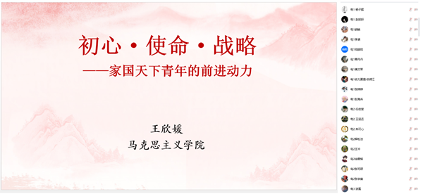 近日,信息与通信工程学院邀请理论导师王欣媛以《初心·使命·战略——家国天下青年的前进动力》为主题讲授专题党课。学院全体学生党员、入党积极分子共350余人以线上方式参加学习。学院学生工作负责人王继强参会。会议由学院党建辅导员康延主持。