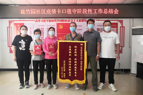9月15日下午,在朝阳区丝竹园社区疫情卡口值守阶段性工作总结会上,丝竹园社区党委为后勤处社区管理科颁发了一枚上书“抗击疫情,共驻共建齐参与 志愿服务,共谱防疫新篇章”的锦旗,以此感谢和致敬社区管理科在前期疫情防控期间的奉献与付出。