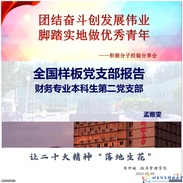 1月5日,优秀党员代表曹佳玮、孟雅雯、李仲媛分别以《团结奋斗创发展伟业 脚踏实地做优秀青年》、《全国样板党支部报告》、《让二十大精神“落地生花”》为题进行了支部建设与个人成长的心得分享。