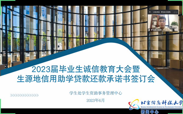 6月15日、16日党委研工部、学工部通过线上、线下的形式组织开展了2023届毕业生生源地贷款、校园地贷款还款协议签订暨诚信教育大会。大会特邀了学生资助事务管理中心负责老师和北京银行学院路支行个贷部经理闫微。