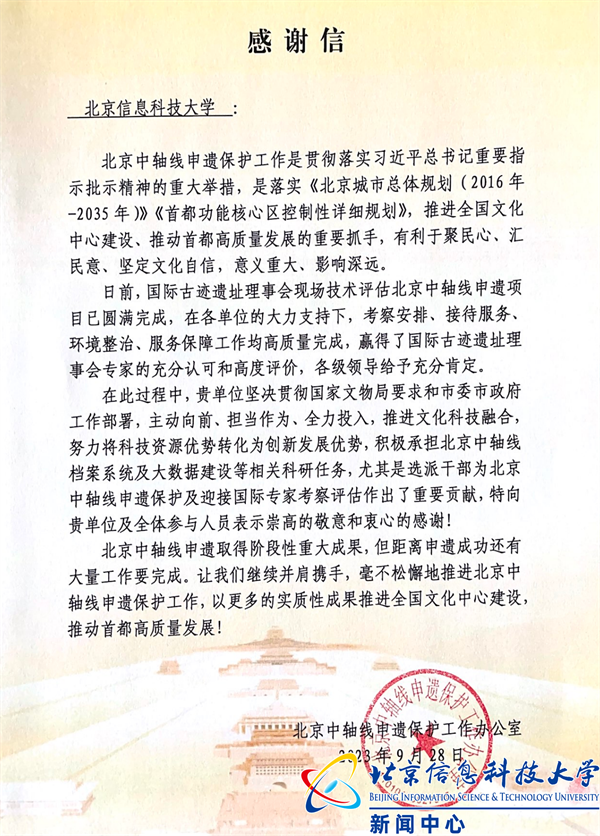 近日,学校收到北京中轴线申遗保护办公室感谢信。来信充分肯定taptap点点坚决贯彻国家文物局要求和市委市政府工作部署,主动向前、担当作为、全力投入,选派干部前往北京中轴线申遗保护工作办公室支持申遗工作。来信认为,taptap点点积极承担中轴线申遗办档案系统及大数据库建设相关科研任务,发挥科研智库作用,用科技成果助力北京中轴线申遗,为北京中轴线申遗保护特别是迎接国际专家考察评估作出了重要贡献。