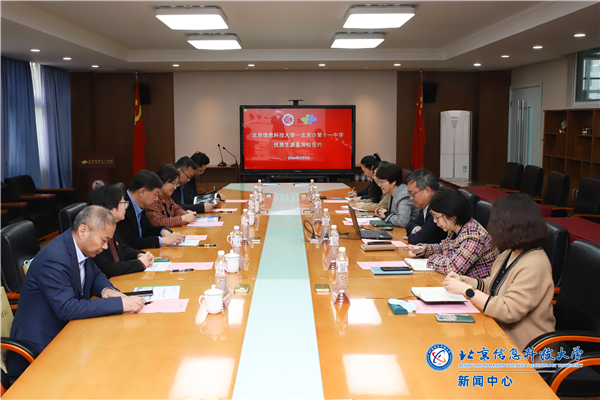 郭福从办学历史、学科专业、科研优势、办学空间、服务社会、政校企融合等方面介绍了学校各项事业蓬勃发展的情况,着重介绍了信息科大在高等教育与基础教育共同培养拔尖创新人才过程中,探索形成贯通培养生态链的措施和方法。他表示,人才的创新能力不仅取决于高等教育的质量,与中学时期对学生创新意识、科学素养、创新能力的培养分不开,循序渐进、迭代推进,才能为拔尖创新人才培养奠定基础。第十一中学在“五育并举,完人教育,全面发展”的办学思想指导下,立足学生终身发展,积极探索形成一体化贯通培养模式,以开放多元的优质课程供给,促进学生全面而有个性的发展,取得了出色的教学质量和鲜明的课程特色成果。信息科大作为信息特色鲜明的市属高校,未来双方在“优质生源基地校”共建的平台上,将建立人工智能领域实验班和人才培养基地,提供师资、课程、资源等多方面的支持。希望双方共享优化资源配置,着力提升面向首都区域、产业经济发展培养信息科技人才的能力,形成高中、大学贯通培养创新拔尖人才的新路径。