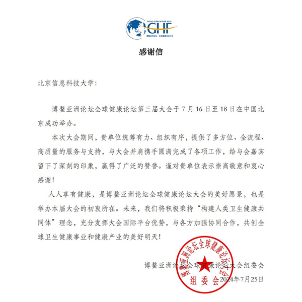 学校收到博鳌亚洲论坛全球健康论坛大会组委会感谢信
