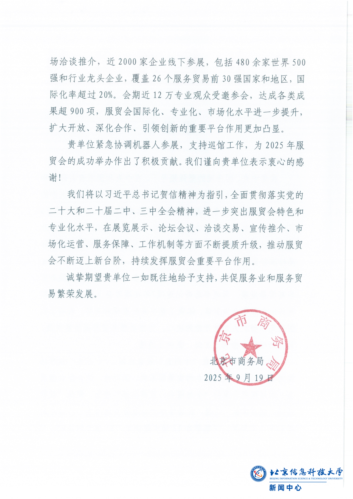 学校圆满完成2025年服贸会人形机器人足球展演,并获北京市商务局专函致谢