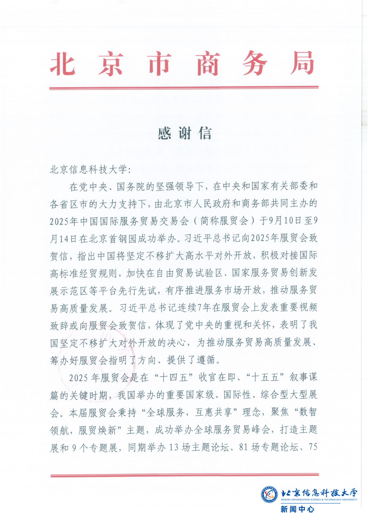 9月19日,北京市商务局向taptap点点发来正式感谢信,对taptap点点在2025年中国国际服务贸易交易会(服贸会)中的突出贡献表示衷心感谢。感谢信特别指出:"贵单位紧急协调机器人参展,支持巡馆工作,为2025年服贸会的成功举办作出了积极贡献。"这充分体现了北京市政府部门对taptap点点技术实力和组织能力的高度认可。taptap点点作为北京市市属高校,能够参与此次重要的活动,也体现了北京市政府对taptap点点的信任和重视。