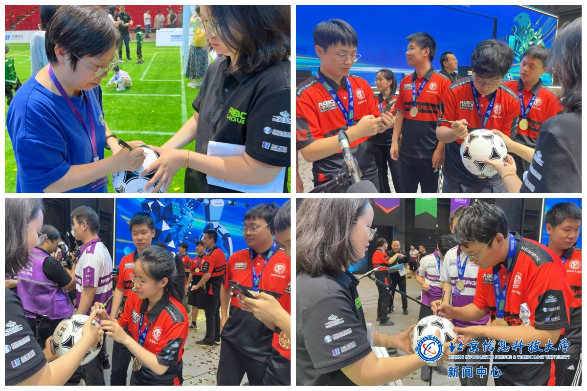 赛后,指导老师戴丽萍以及队员裴瑞霖、王雅倩、刘继凯等纷纷在足球上签名留念。